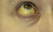 피부와 눈 흰자위가 노랗게 변색되는 ‘황달’ 증상이 나타납니다 - 특히 눈동자 흰자위부터 노래지는 것이 초기에 잘 관찰되는 특징